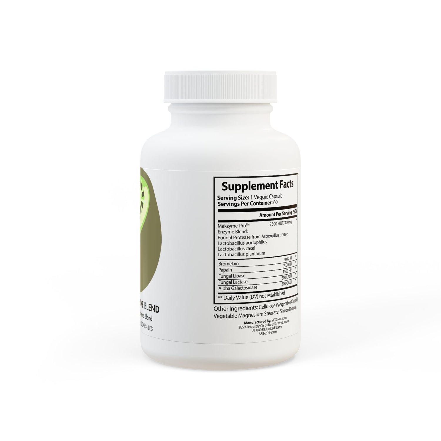 Ingredients: Makzyme-Pro™, Enzyme Blend: Fungal Protease from Aspergillus oryzae, Lactobacillus acidophilus, Lactobacillus casei, Lactobacillus plantarum, Bromelain, Papain, Fungal Lipase, Fungal Lactase, Alpha Galactosidase. Other Ingredients: Cellulose (Vegetable Capsule), Vegetable Magnesium Stearate, Silicon Dioxide.